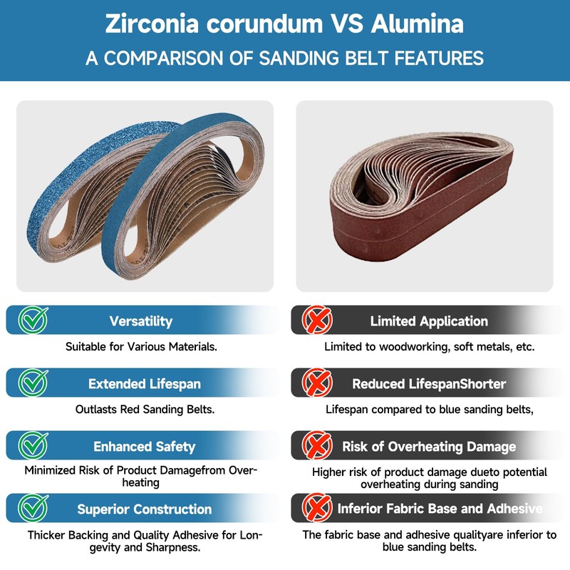 - 【Preliminary Material】- Unlike other sanding belts, our belt sander paper is made of blue zirconium corundum grains, which is waterproof, high hardness, heat resistance, more durable than the aluminum oxide belts