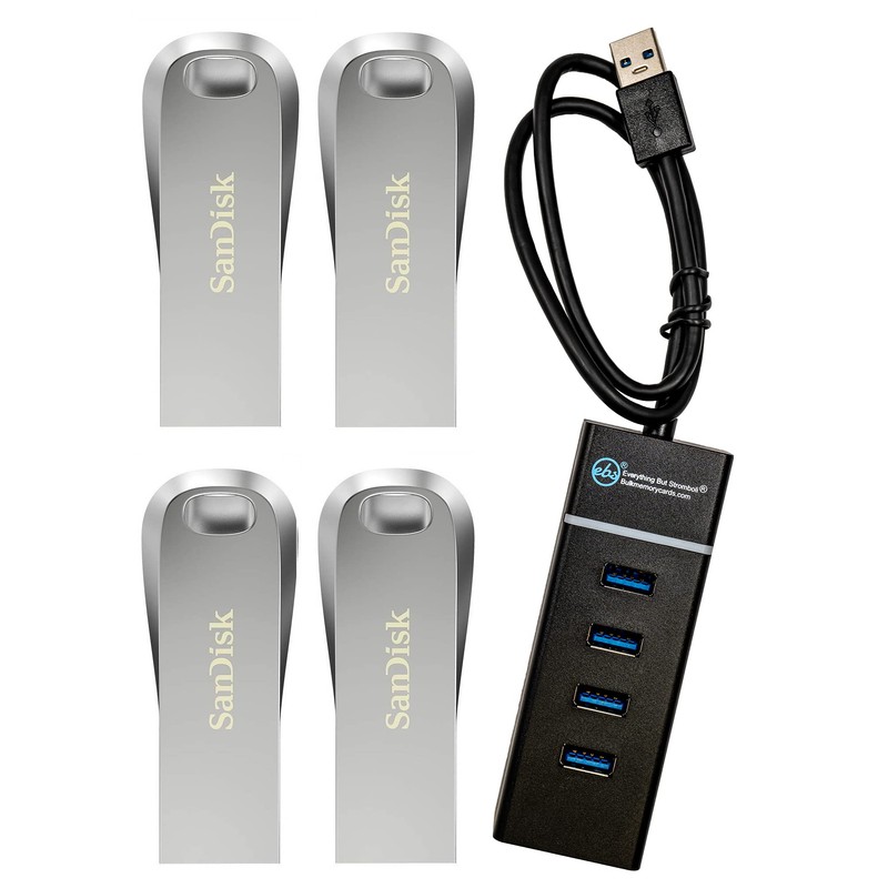 - Bundle includes (4) 32GB SanDisk Flash Drives Ultra Luxe with USB 3.1 Gen 1 speeds and (1) Everything But Stromboli 4 Port USB 3.0 Hub