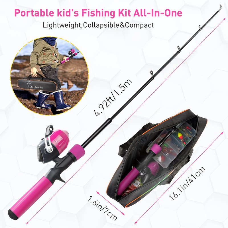 - 【Angelrute für Kinder】 Diese Kombination aus Angelrute und Rolle enthält alles, was ein Kind braucht, um mit der praktischen Tragetasche zu beginnen – Teleskoprute 4,92 FT für Jungen Mädchen + Angelrolle mit vorgewickelter Schnur und 50 m zusätzlicher Schnur + 64 bunte Köder und Haken in der Angelbox + Tasche Transportbox + Bedienungsanleitung