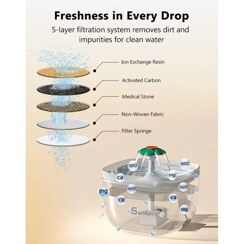 Replaceable Filter: To keep your pet's drinking water clean, we recommend replacing the filter every 2 weeks. Search for "Sandpoy Cat Water Fountain Filter” to purchase the genuine replacement filter