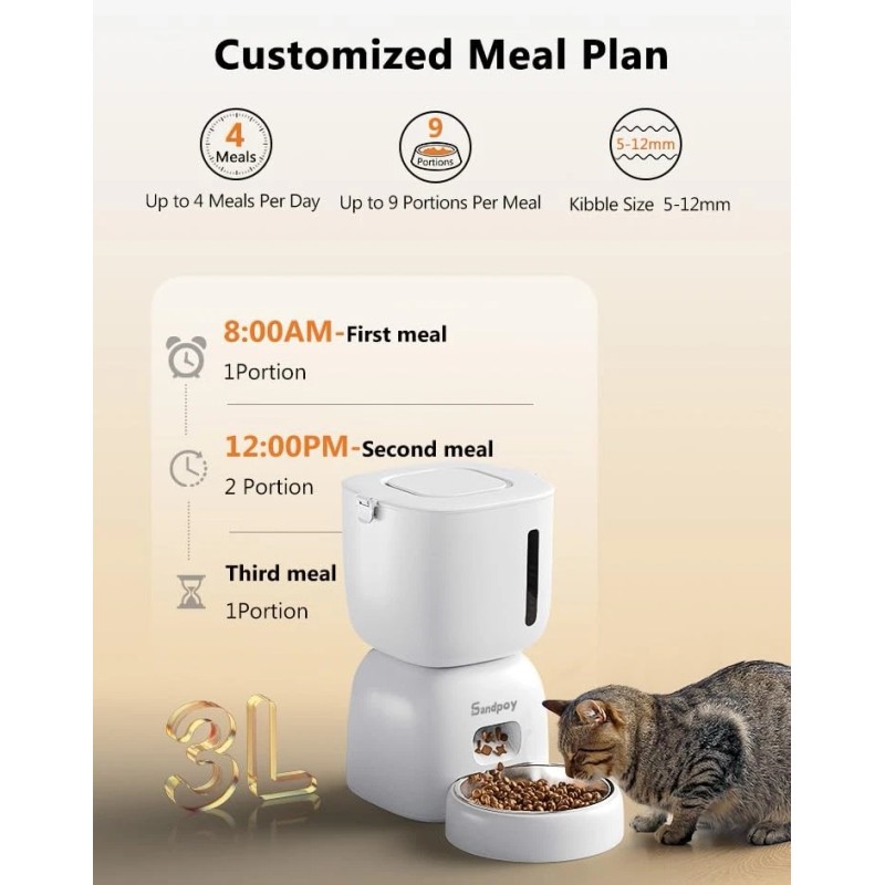 Precise Feeding: Whether you're working late, on vacation, out, or asleep, our auto cat feeder ensures your pet gets their meals on time. You can schedule up to 4 meals per day with 1-9 portions each, ensuring a balanced diet and avoiding overeating. The 3L automatic cat feeder can provide for a 12-pound cat for 15 days or a 22-pound dog for 8 days
