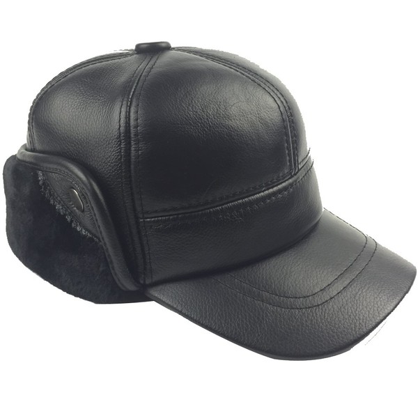 Sandy Ting Winter Leather Baseball Cap Earflap Fitted Hats Men Soft Hunting Hat, Black, Medium