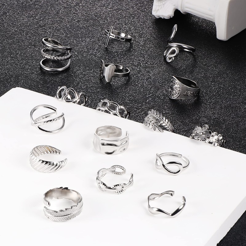 Sanfenly 16Pcs Stainless Steel Rings for Women Open Knuckle Stackable Rings Adjustable Aesthetic Silver Rings Snake Leaf Feather Butterfly Chunky Thumb Finger Rings Trendy Simple Statement Rings Non Tarnish Indie rings