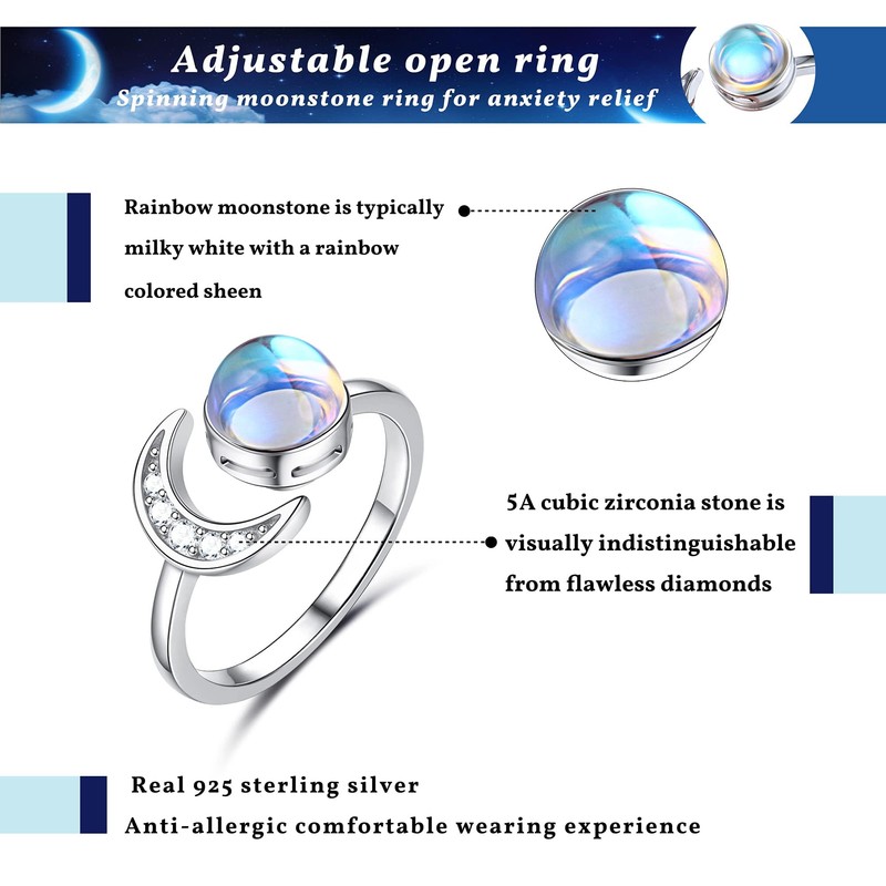 - 【Premium Materials】Adjustable anxiety fidget ring is crafted from 925 sterling silver and 18K white gold plated, well-polished surface which is hypoallergenic, not turn skin green, tarnish or fade. Shiny moon is inlaid with high quality 5A+ cubic zirconia. Wrap open ring, flexible size to adjust, fits most finger sizes.