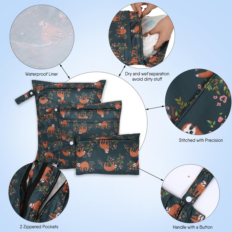SANFERGE - 3 bolsas de pañales de tela para bebé, impermeable, reutilizable, con 2 bolsillos con cierre y asa, bolsas de lavandería lavables para viajes, playa, piscina, guardería, yoga, gimnasio, ejercicio, trajes de baño, SML, perezoso