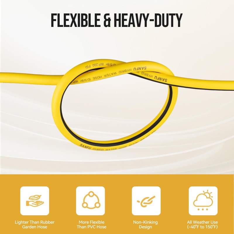 - 🍃【Kinking Resistant】 - The hybrid material is more durable, abrasion-resistant, and has no memory.The hybrid material make the hose work in extreme cold weather and remain flexible and kink resistant for prolonging lifetime. The flexible in cold weather temperature range is down -40°F to 150°F which is suitable for professional garden lawn and car washing.