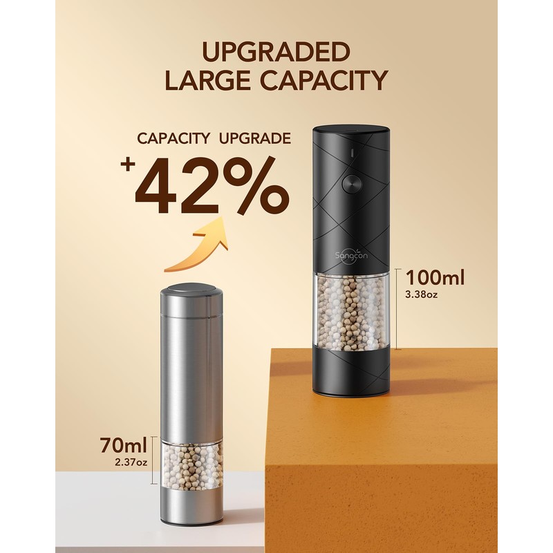 - LARGE CAPACITY & LIGHT WEIGHT - With a generous capacity of 66g / 100ml, this automatic salt and pepper grinder set allows for ample storage of salt or pepper. Crafted from lightweight materials, the salt grinder shakers are especially friendly to those with wrist discomfort, providing convenience without sacrificing capacity. Sangcon salt and pepper shakers set electric appears to offer practicality and aesthetics rolled into one, enhancing your culinary experience with ease and elegance