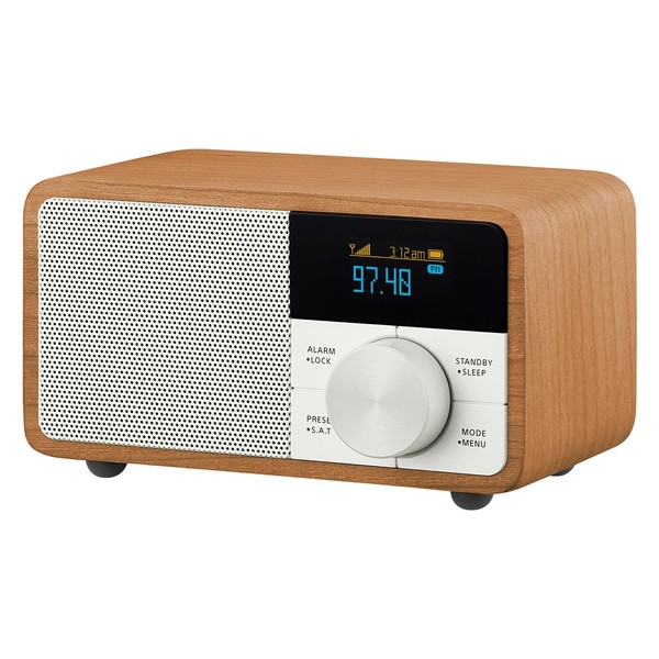Sangean WR-305 Wide FM Radio Bluetooth Speaker with OLED Display, Cherry, Wood Cabinet, Compact Speaker in Palm, Alarm Function