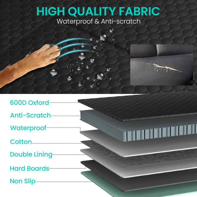 - 【Waterproof & Durable】Back Seat Pet Cover for Dogs for car formed by 7 layers of selected high quality material composite. The first layer is high quality 600D Oxford cloth, which has excellent tear resistance, durable and good care. The second layer is waterproof PVC coating, double waterproof effect, no need to worry about the dog's liquid penetration into the car seat. Also the PP cotton filled inside provides your dog with good comfort.
