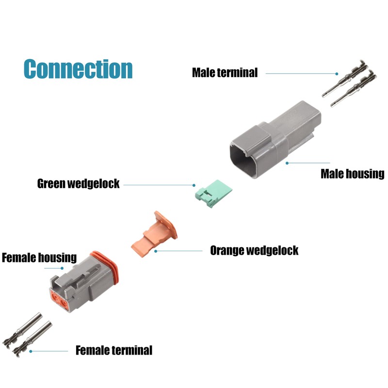 • Package included: 10x 2-pin DT connectors, includes 10x male plugs, 10x female plugs, 20x Male contact, 20x Female contact, 10x Orange wedgelock, 10x Green wedgelock.