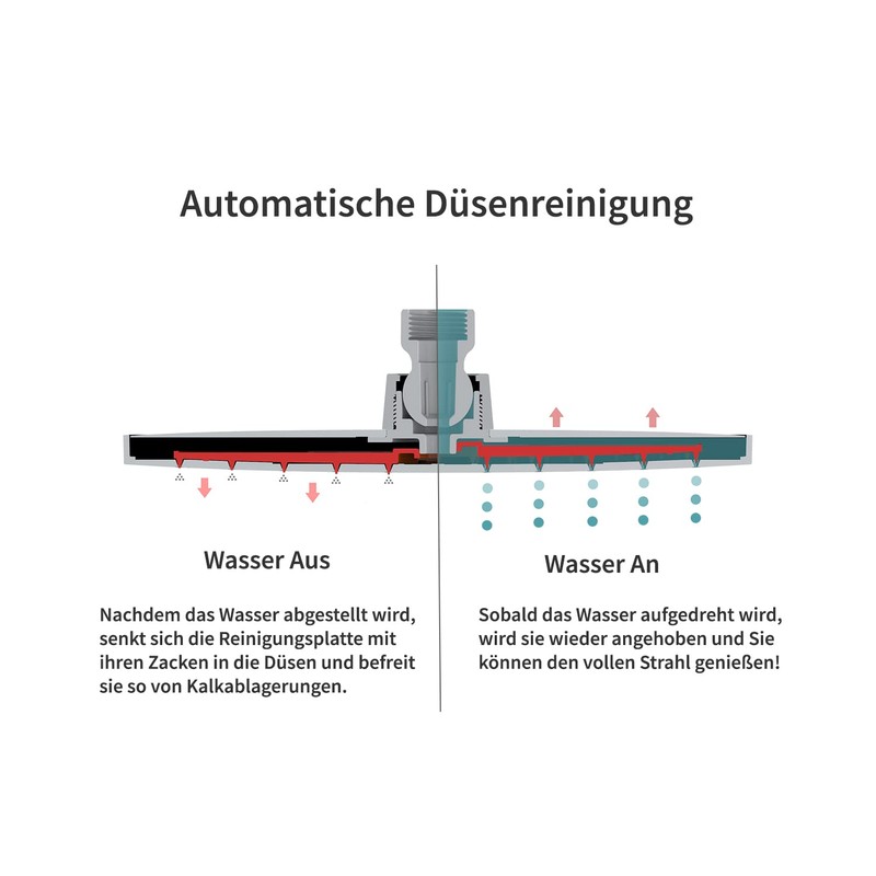 - The self-cleaning rain shower. No more clogging nozzles due to limescale deposit. With the self-cleaning function, all nozzles are automatically cleaned and thus constantly kept free of deposits.