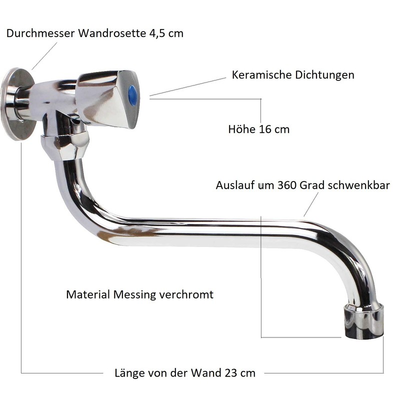 • Dimensions: length from the wall: 23 cm / height to outlet: 16 cm (see diagram) standard 1/2 inch wall connection
