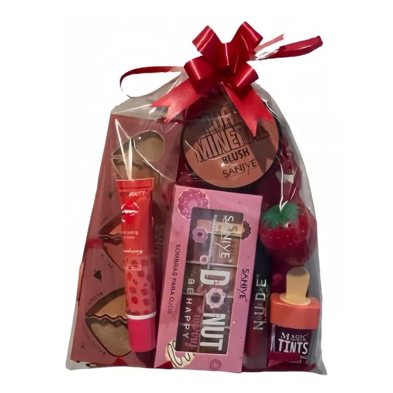 Algunos ejemplos productos que puede contener el regalo son: Labiales líquidos y en barra, rubores, sombras, tintas para labios, iluminadores, lip gloss, etc.