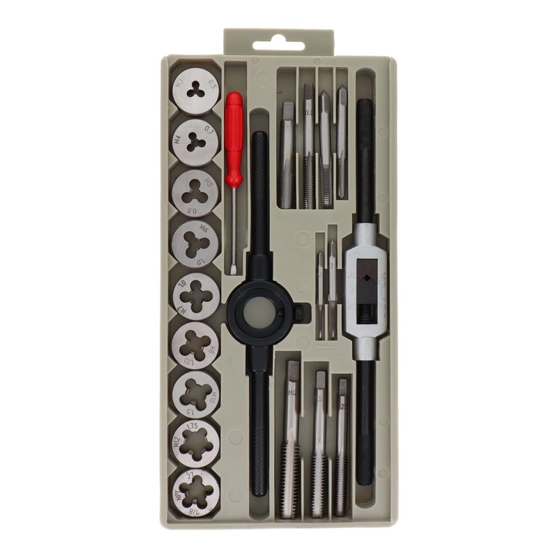- Set Includes: 18 PCS Tap & Dice (M3 x 0.5, M4 x 0.7, M5 x 0.8, M6 x 1.0, M7 x 1.0, M8 x 1.25, M10 x 1.5, M12 x 1.75, 1/8NPT2, Dice Stock 25 mm, Screwdriver