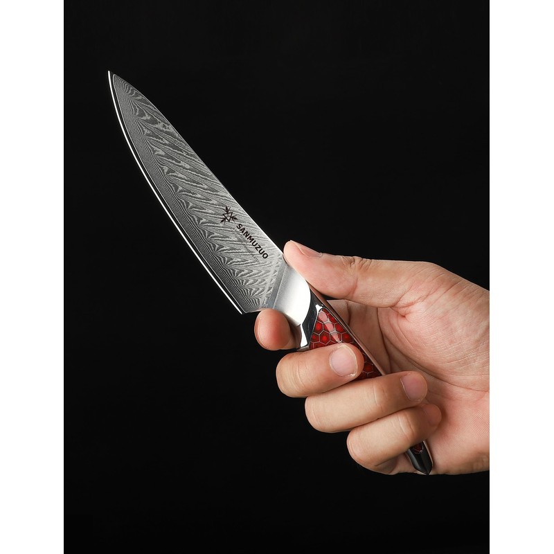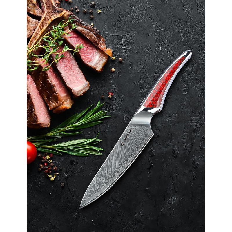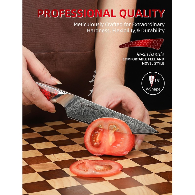 SANMUZUO 5 inch Utility Knife, Japanese VG-10 Damascus Steel Kitchen Knife, Ultra Sharp Fruit Knife with Full-tang Handle in Red Resin, LA-S9 Series