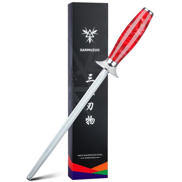 SANMUZUO ホーニングロッド、 包丁用シャープニングスチール、9インチ 樹脂ハンドル付きホーニングスチール - XUANシリーズ (サンセットレッド)