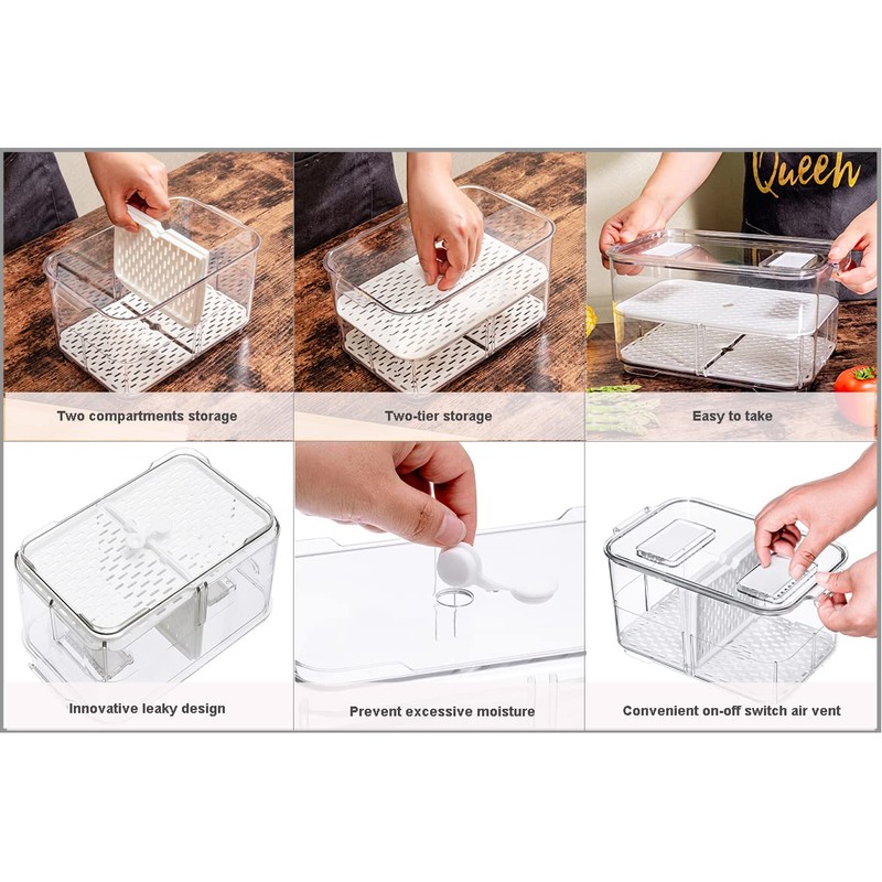 - Innovative design, the middle crisp tray can be changed into two small compartments or two layers to store what to your needs. The bottom crisp tray helps keep moisture away from food and promotes air circulation to reduce spoilage.This storage organizer is sized to keep fruits and vegetables.