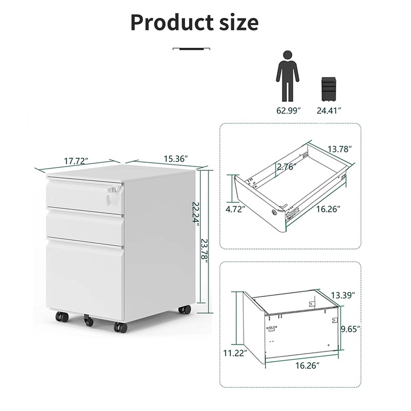 - Vertical storage filing cabinet uses steel as material to ensure the durability and sturdiness. It is suitable for daily use, at home or in office. load capacity up to 330 lbs, Strong Enough to Put Your Printer on or Other Office Products, size( include the casters) : 17.72"D x 15.36"W x 23.78"H,This file cabinet fits under most desks, add security to your office.