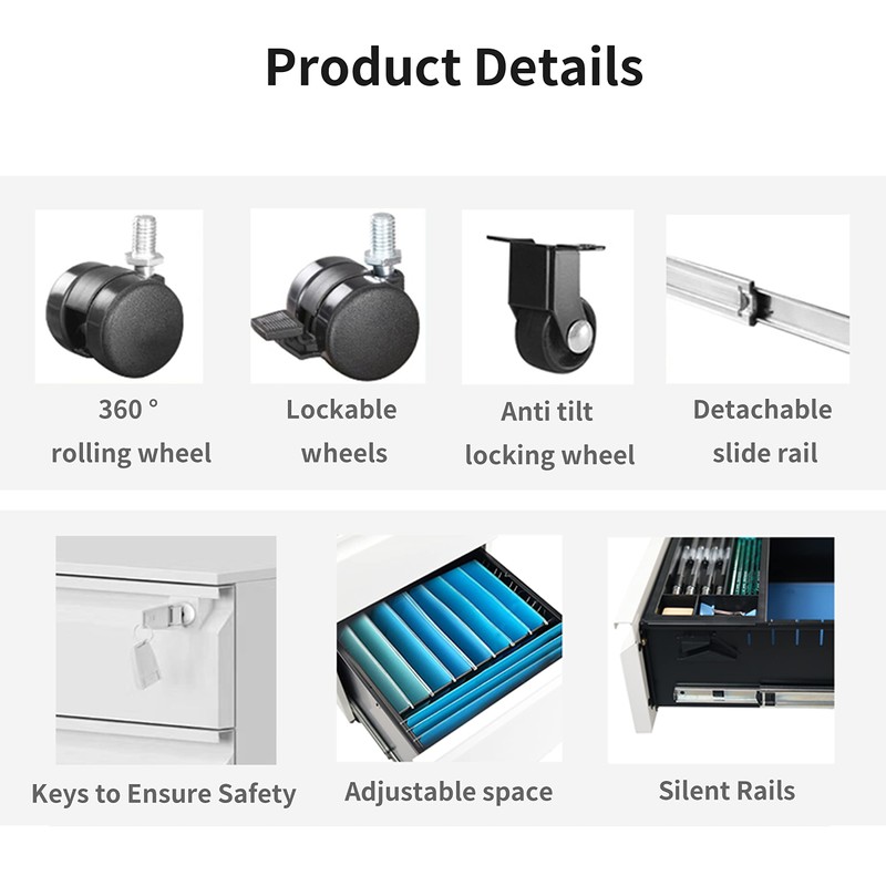 - Unique design of anti-tilting filing cabinet, Only one drawer can be opened at a time to prevent the center of gravity from shifting to one side.You can move the cabinet easily with the wheels and it is convenient for you to move it to another place.Five casters include two front lockable casters and one center caster to prevent tipping.