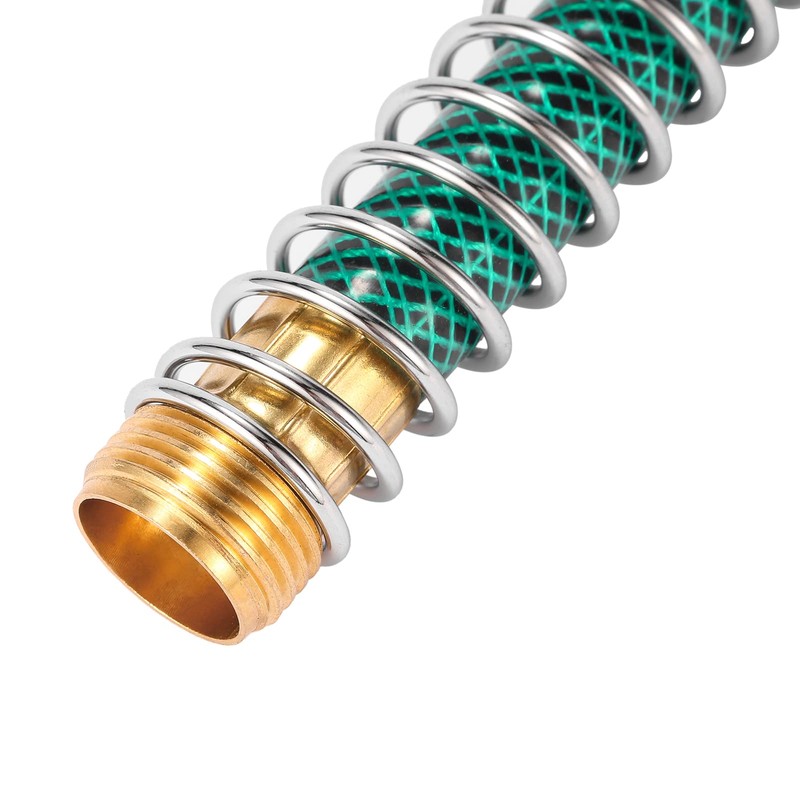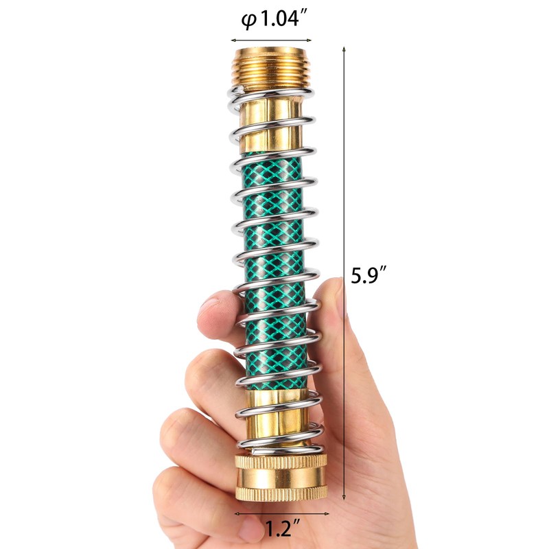 2 Pack Hose Extension Adapter with Coil SpringMaterial:Brass Connector, PVC Hose, Stainless Steel Spiral RingPackage Include: 2 pack garden hose protector guards & 4 pcs rubber washersProduct Features:Heavy duty brass construction, ends 3/4" thread connection.NOTE:To prevent leakage, make sure the connector has rubber ring. If water leaks after a long period of use, please replace with a new washer.