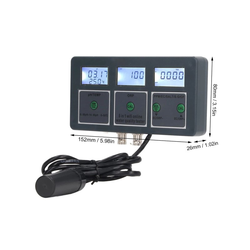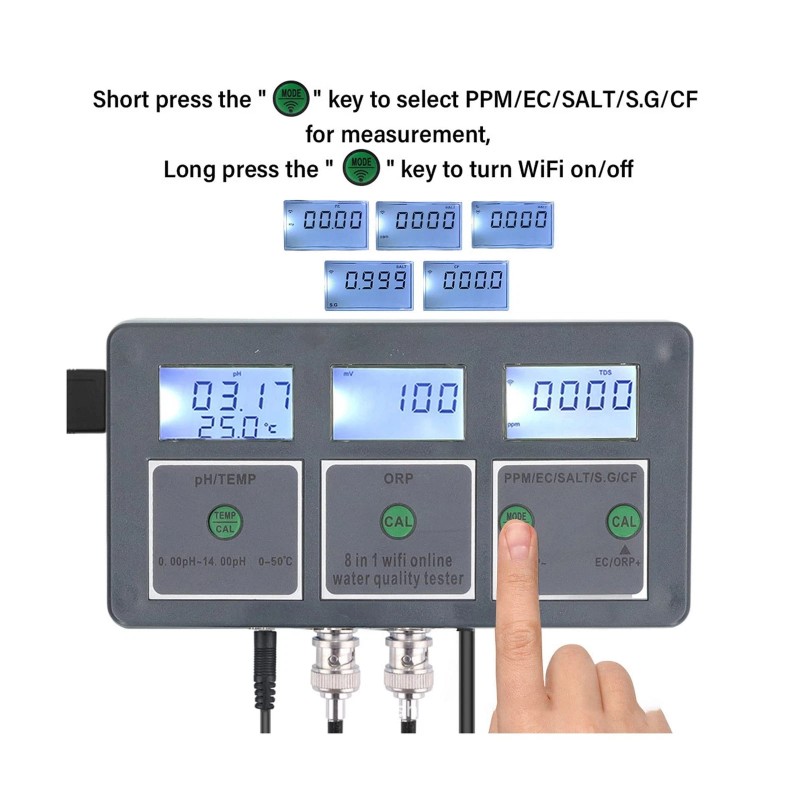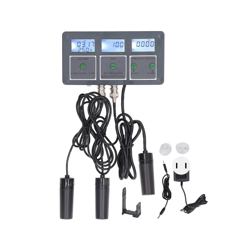 • 8 IN 1 ONLINE WATER QUALITY TESTER: S.G EC SALT ORP CF TEMP 8 parameters, online remote monitoring, real time data reception, data automatically stored and saved after 30 days