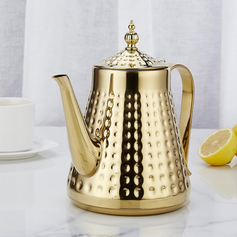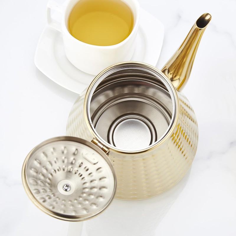 SANQIAHOME Stainless Steel Teapot 1.6L(54oz) 5-6 Cups,with Removeable Infuser,Good Pour,Hammer Patterned, Brew Loose Leaf Tea Bag,Gold
