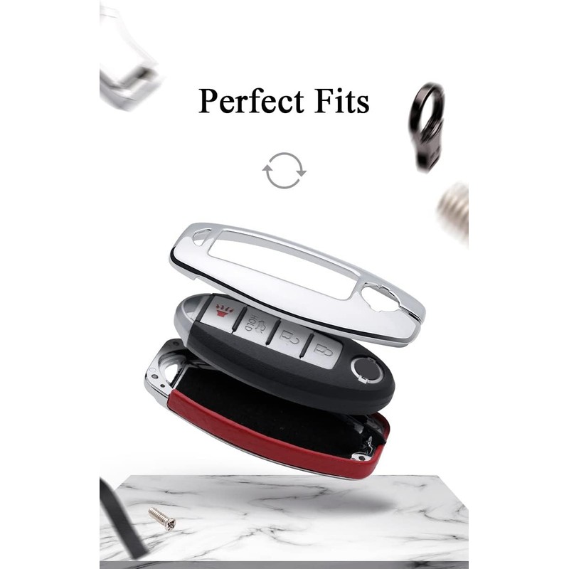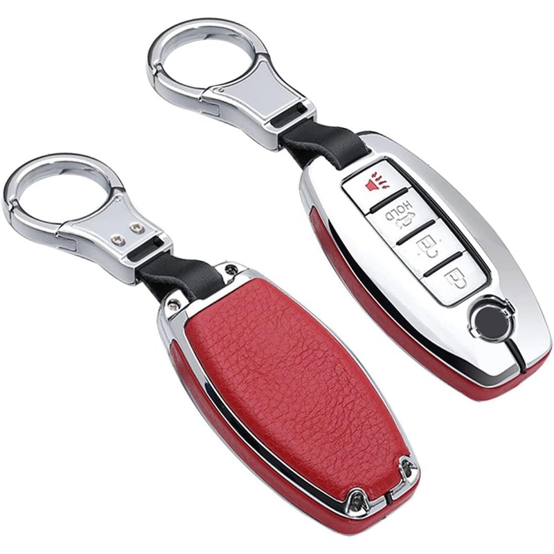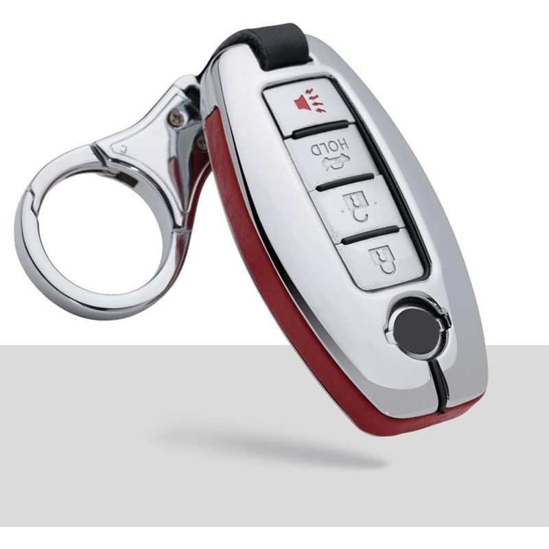 SANRILY 1Pcs Leather Key Fob Cover for Nissan Altima Armada Maxima Murano Pathfinder Rogue, for Infiniti JX35 Q50 Q60 QX56 QX60 QX80 Keyless 3/4/5 Button Smart Key Case with Keychain Silver-Red
