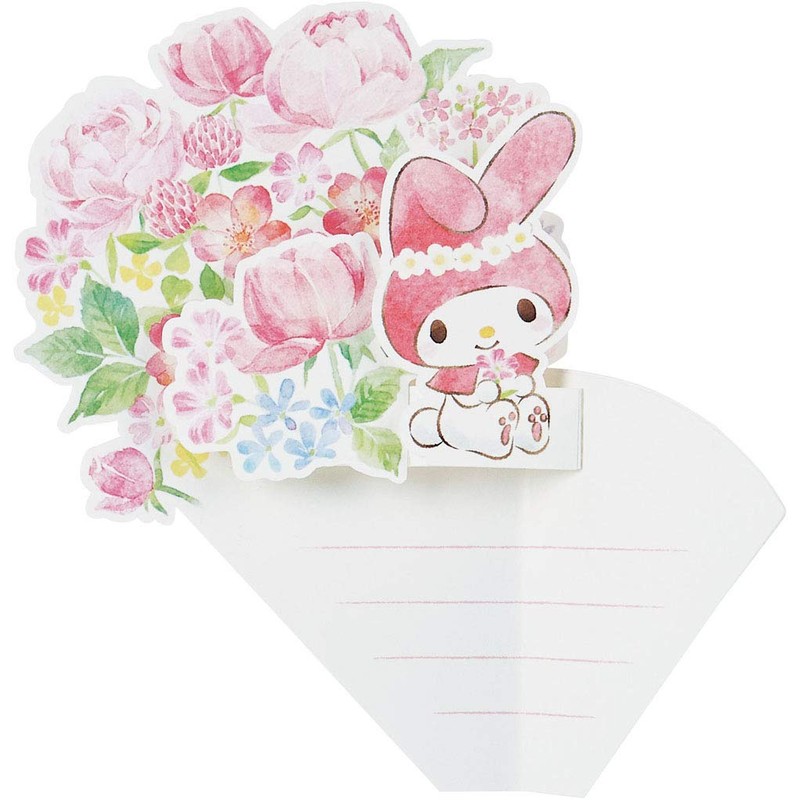 - Cute multipurpose card with My Melody inside a bouquet filled with lots of flowers. Open the card and some of my melody and flowers. Lace pattern transparent cover Card opens to reveal a message space