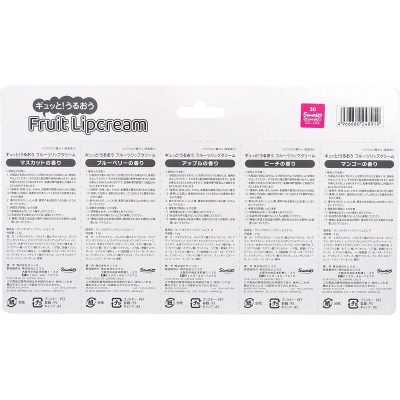 Sanrio Characters Tight! Moisturizing Fruit Lip Balm, Japanese Pattern, 0.1 oz (3.5 g) x 5 Bottles