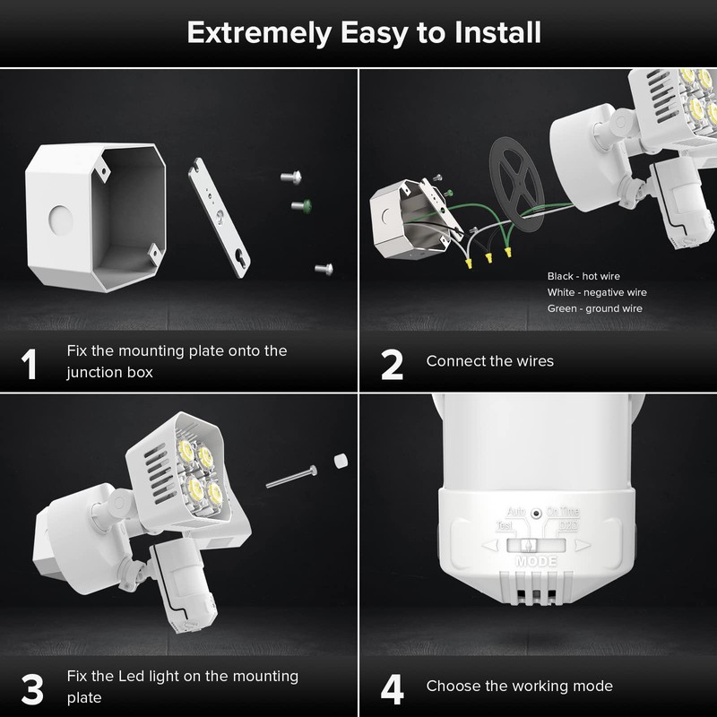 - Adjustable Design: There are four working modes, Test Mode, Auto Mode, On Time Mode and Dusk to Dawn Mode. More choices can meet different demand for each customer. Choose the most appropriate mode for your needs and desires.
