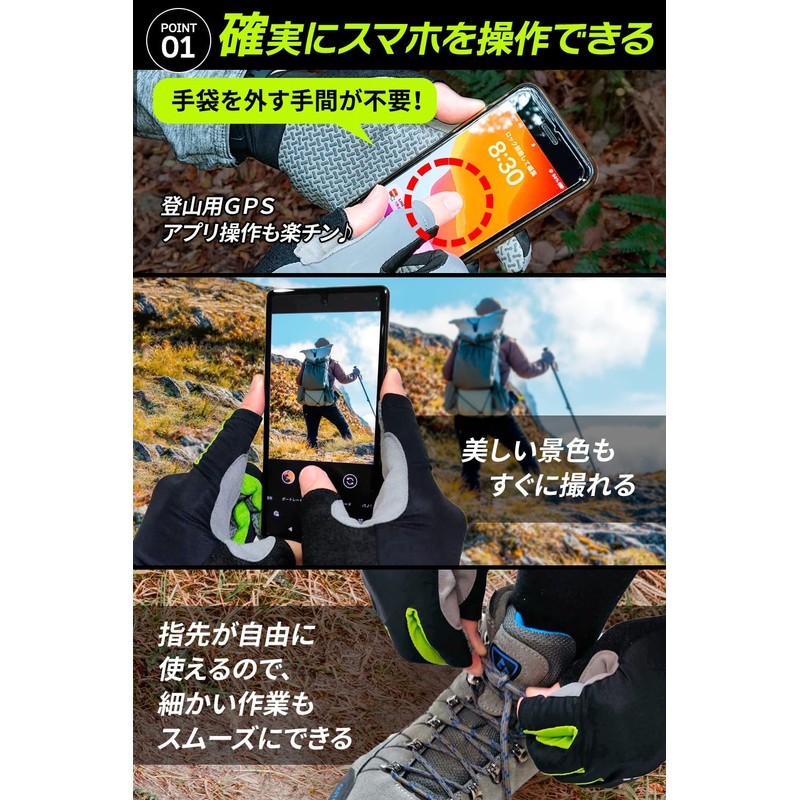 - (Reliable smartphone operation & detailed work) Fingerless design with exposed index finger and thumb tips allow you to operate your smartphone and take photos smoothly. You can safely perform detailed tasks such as shoelaces that untied during mountain climbing, opening and closing plastic bottles. It is also a great fishing glove for climbing gloves, but also for fishing