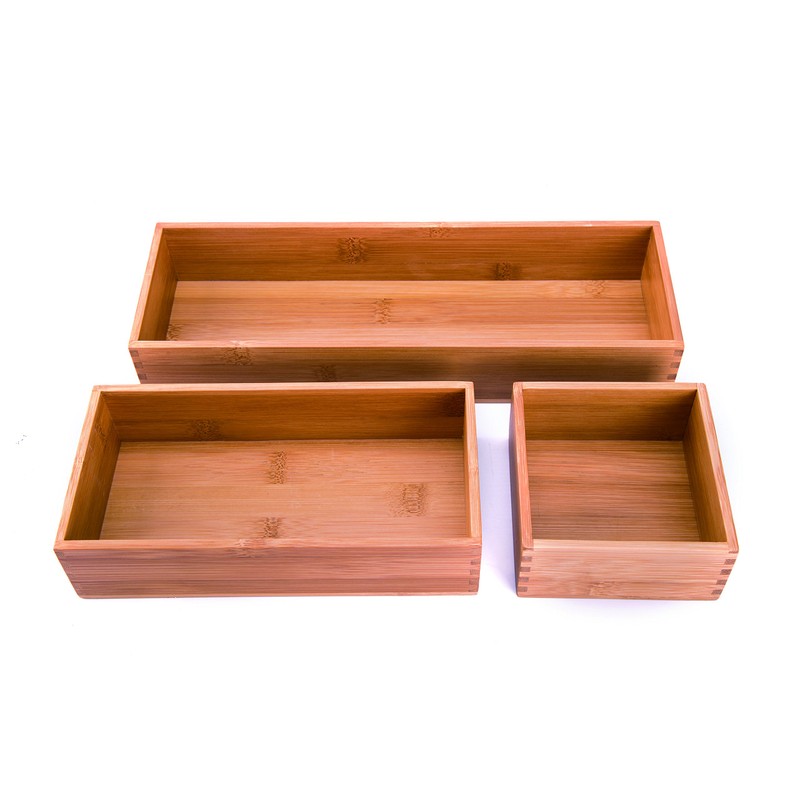 **Sansnow bamboo organizer boxes** Material: 100% Bamboo Craft: Mortise and tenon joint structure & Manual polishing & Manual filling ash Suit for: Drawer & Desktop & Wardrobe & Dresser Measure: · 1# box: 12"x4"x2"H **WHY CHOOSE SANSNOW** **Bamboo** Sansnow bamboo products only use the best nature bamboo which is growth in the south of China. Only the climate and environment in the south of China can plant the bamboo which we need. The density, strength and width of the bamboo determines the quality of the products. **Carbonization** The advantages of carbide: 1)Good strength 2)Form a layer of protection membrane on the surface of bamboo, a smooth surface can avoid scratch your skin 3)Carbonized bamboo not bibulous, resistant to moisture, not easy deformation, not easy craze, the stability is higher 4)Natural bamboo contains bamboo fiber, carbonization can make it play the maximum effect. **Workmanship** We use mortise and tenon joint structure, which is over thousands of yeas history. It can make most closely link between each component, so as to achieve maximum strength. Not only can bear larger load, but also allowed certain deformation. The formation of our product are high temperature and pressure by multilayer bamboo piece, the structure is more stable. This is the most visible difference compared with others' products. **Noted:** 1)Please allow a little smell of bamboo when you first time open it, it's harmless. 2)Please allow a little color difference due to bamboo has different texture. 3)Our factory has multiple bamboo products's patent, product quality is perfect. 4)Many processes are manual, if the product is defective, please contact us at the first time. **DO HOME PRODUCT, SANSNOW IS SERIOUS!**