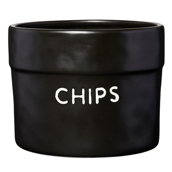 - TACO PARTY SERVING DISH Stylish black ceramic bag-style bowl reads, "CHIPS" in white writing