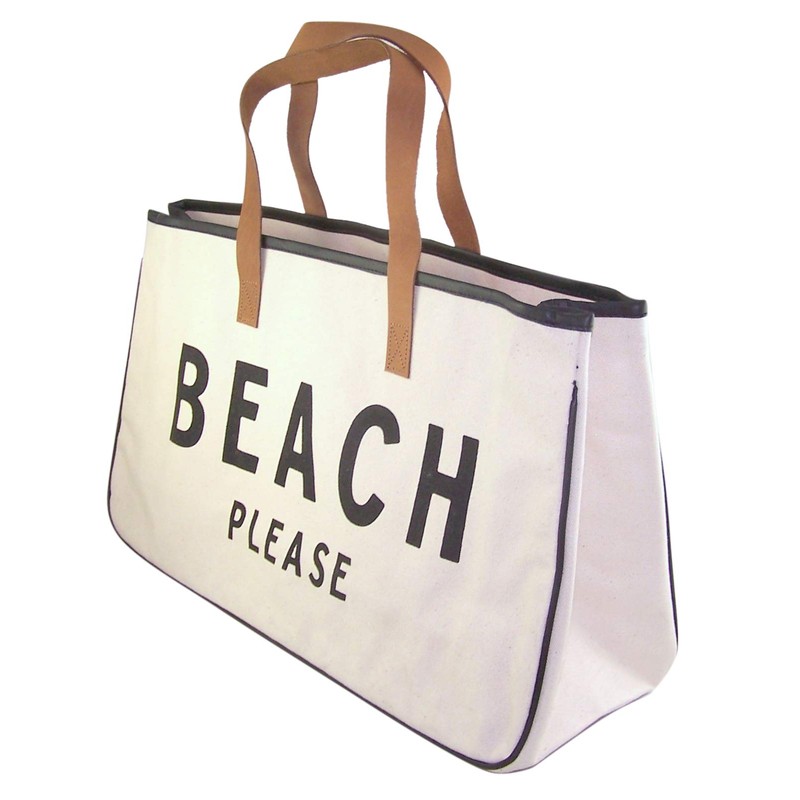 - BEACH PLEASE is written in bold black lettering on white canvas with genuine brown leather handles and black leather trim