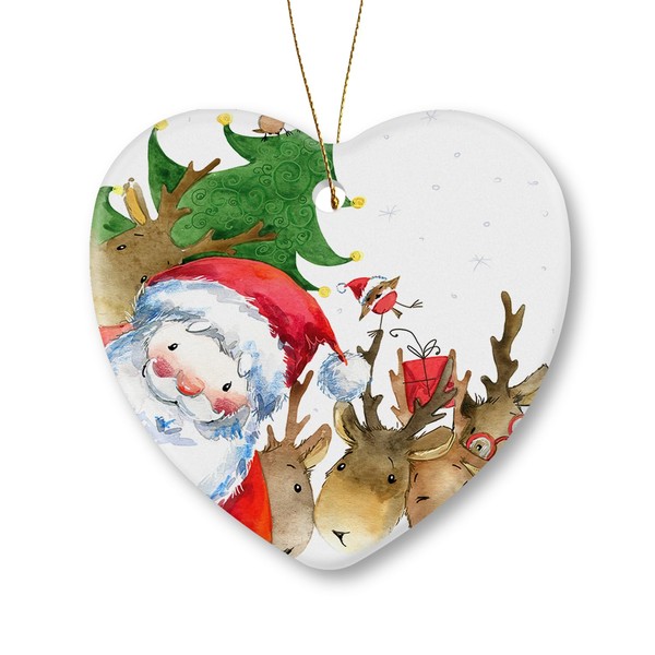 Santa Claus with Reindeer Christmas Ornaments Ceramic Christmas Tree Decorations Durable Heart-shape Hanging Ornament 3.22X3.07in