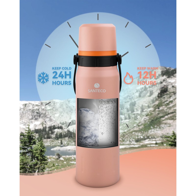 - HOT OR COLD FOR HOURS: SANTECO thermos flask adopts premium double-walled vacuum insulated technology that can keep your coffee or tea warm for 12 hours or cold for 24 hours. Your favourite drink is at the perfect serving temperature at any time. PS: lid also acts as a drinking cup