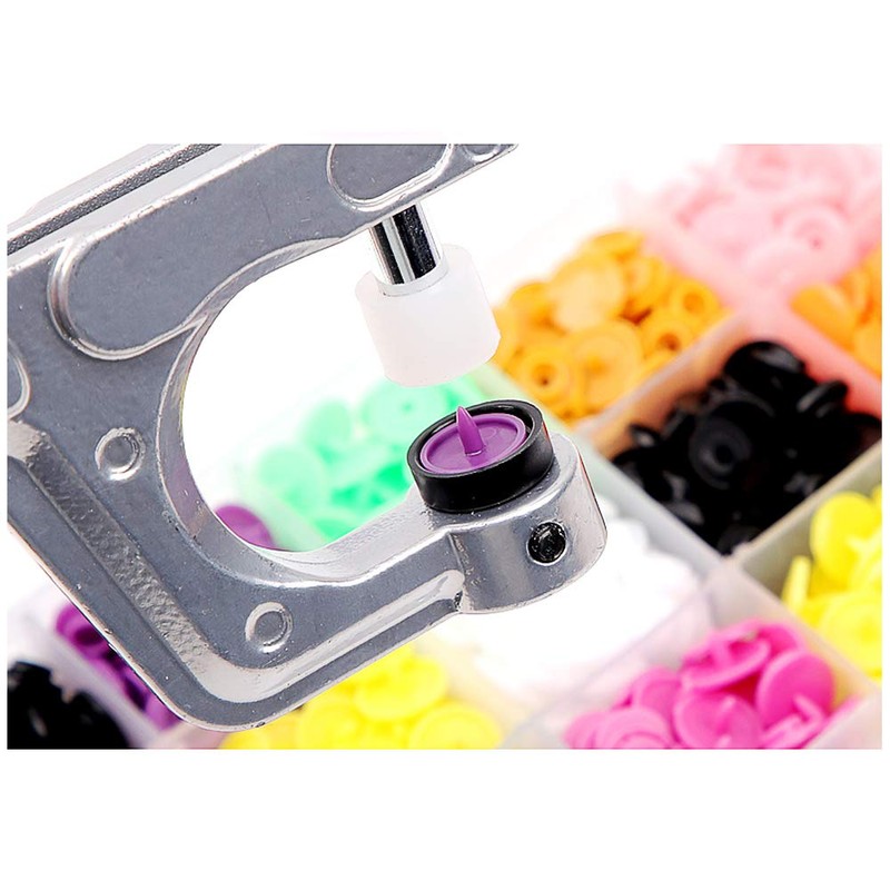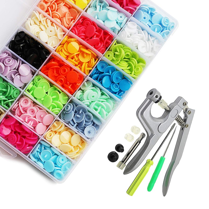 - Product Specifications & Set Contents: Snap button material: oil and pliers: aluminum. Snap button size: diameter about 12mm(T5) 360 Buttons, 1 Plier, 1 Metal Rod, 3 Plastic Caps, 1 Screw Driver, 1 Shouth, 1 Tweezer
