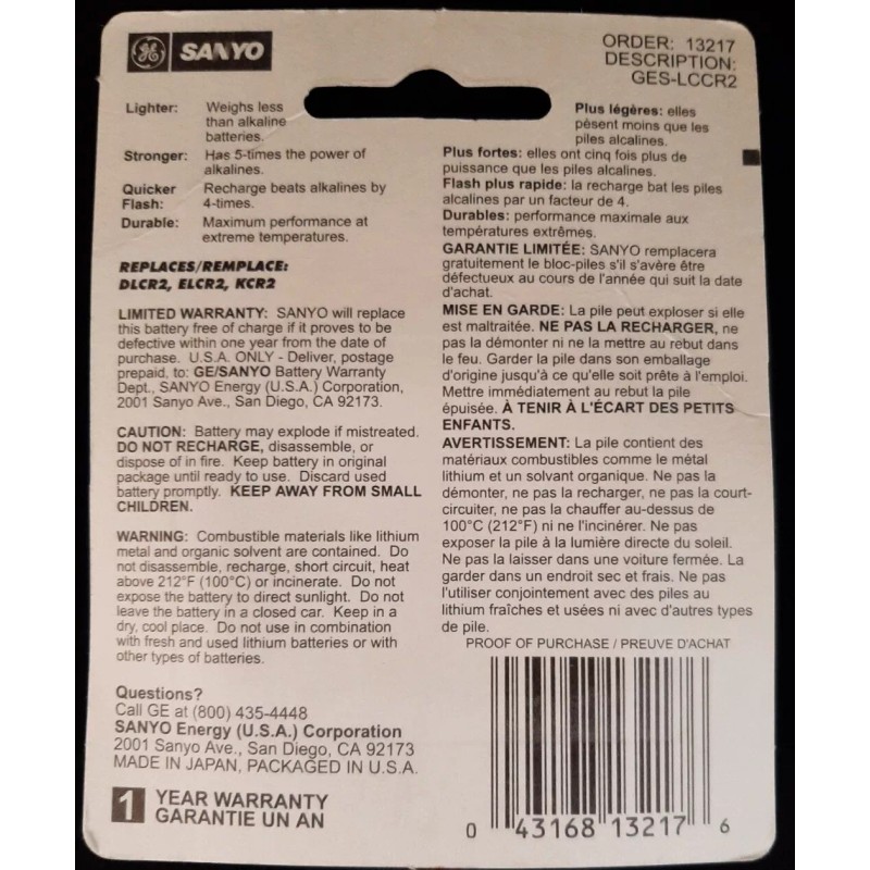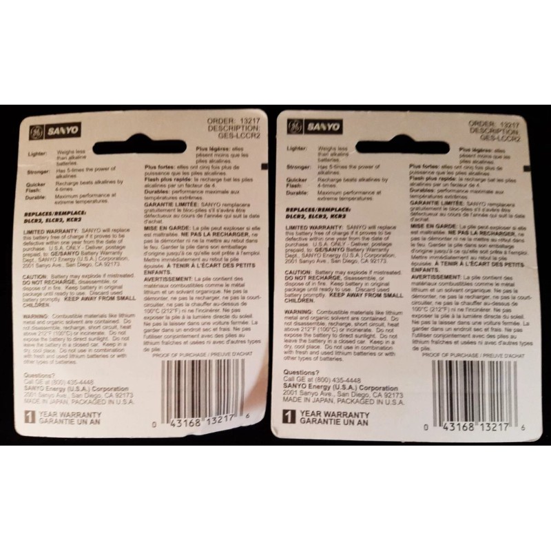 SANYO Lot of 2: NOS GE SANYO CR2 Photographic Lithium Battery Replace DLCR2 ELCR2 KCR2