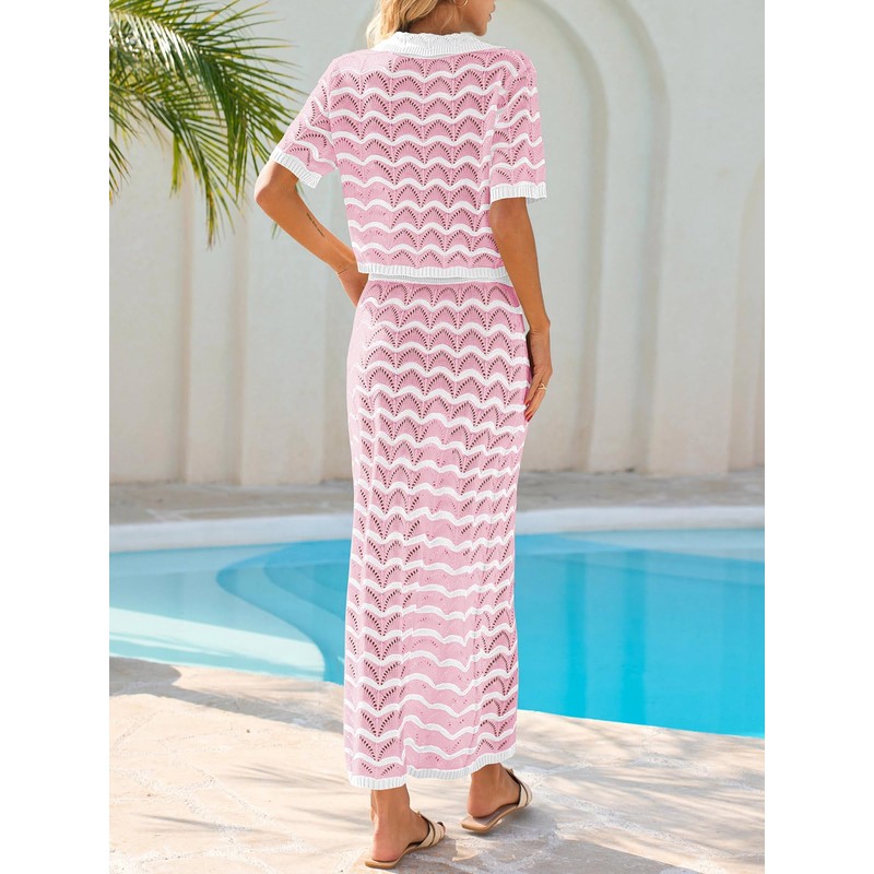 Saodimallsu Women Striped Beach Cover Up Set Button Short Sleeve Collared Crop Top Maxi Skirt Crochet 2 Piece Outfits Pink