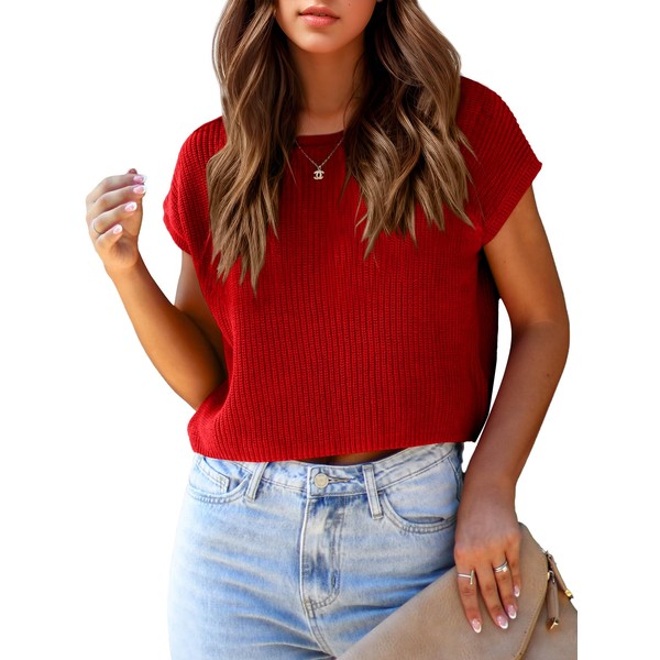 Saodimallsu Womens Cap Sleeve Crop Tops Summer Trendy Going Out Crew Neck Loose Knit Cropped Sweater Vest Tank Top Red