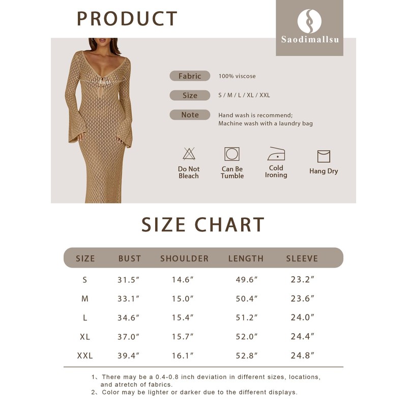 Saodimallsu Womens V Neck Crochet Maxi Dresses Bell Sleeve Bodycon Long Dress Hollow Out Summer Beach Vacation Cover Up Khaki