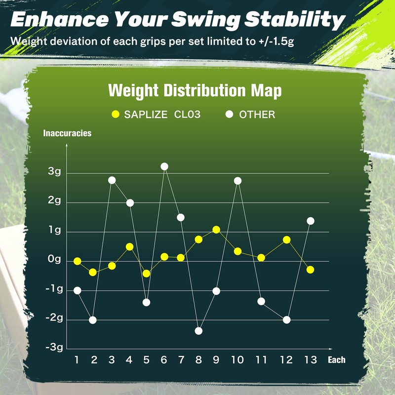 - Nice Consistency of Grips: The weight deviation of the 13 grips set is limited to +/-1.5 g. Comparing with the industry standard of +/- 3 g, this will greatly enhance your swing stability and allow you to fully enjoy your golfing time