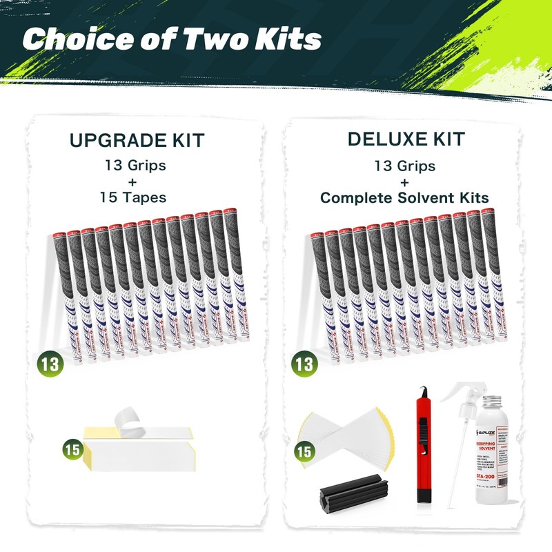 - Multiple Choices: Three sizes: standard/mid/jumbo. Six colors: White, Grey, Blue, Red, Green, Orange. Two bundles: Upgrade Set (include 15 tapes for free), Deluxe set (includes full regripping kit)