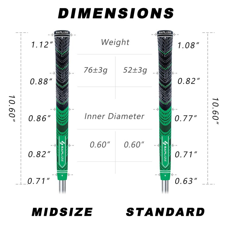 • Package specifications: standard size golf grip set. Core size: 0.600", Handle length: 10.60", Weight: 75g.