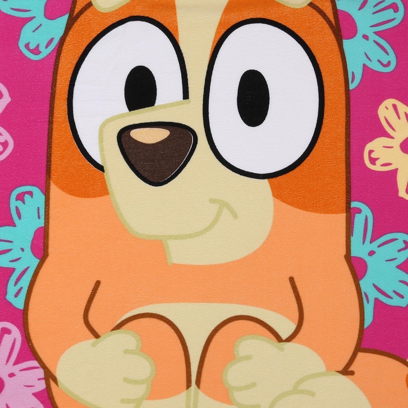 - The large print features the adorable character Bingo on a bright pink floral background that makes the towel a cheerful focal point.