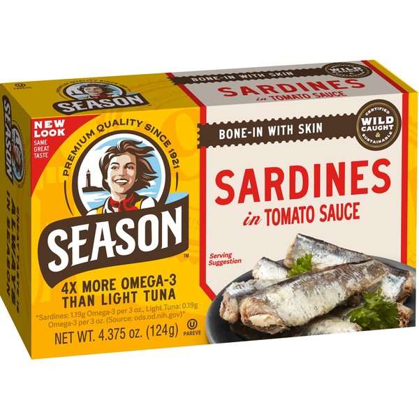 Season Sardines in Tomato Sauce, Salt Added, All Natural, Wild Caught.