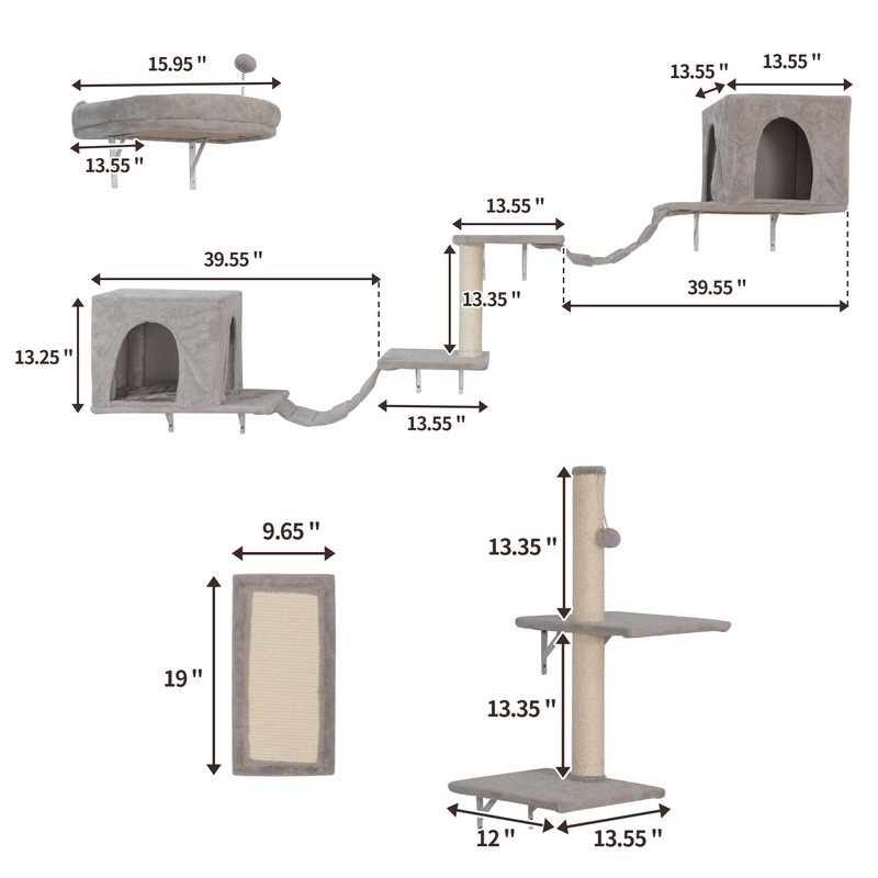 These pieces can be rearranged in any design with a clear user manual to create your own complete cat wall climbing system and just pay more attention to the right height to make sure that your cat can jump easily from one piece to the other.