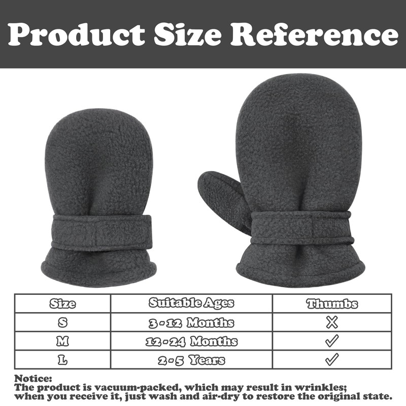 - SIZE INFORMATION & WASHING INSTRUCTIONS: The baby girl mittens and toddler boy gloves are available in 3 sizes. Size S is recommended for 3-12 months; Size M is recommended for 12-24 months; Size L is recommended for 2-5 years. And Size S without thumb, this design is more suitable for infants. Size M and Size L both have the thumb, which makes it easy for toddlers to grab or hold things while playing outside. To keep the baby fleece mittens soft and warm, suggest washing by hand gently!