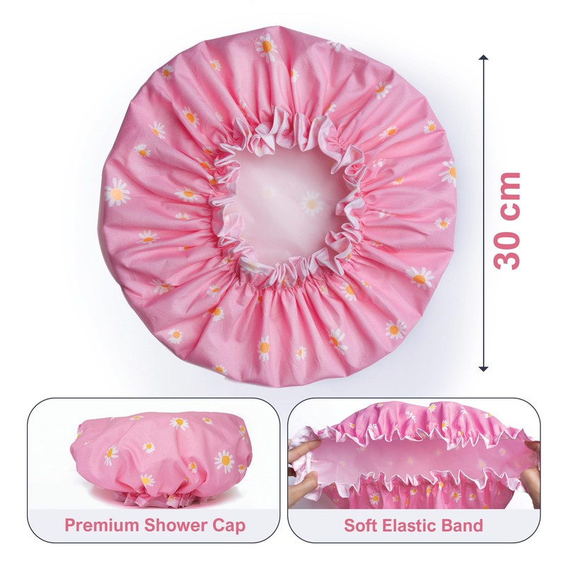 SARG Premium Double Layer Shower Cap for Women with Unique Flower Design- Reusable Shower Cap for Hair - Waterproof Plastic Cap - Shower Caps for Long, Short and Curly Hairs (Bubblegum Burst)