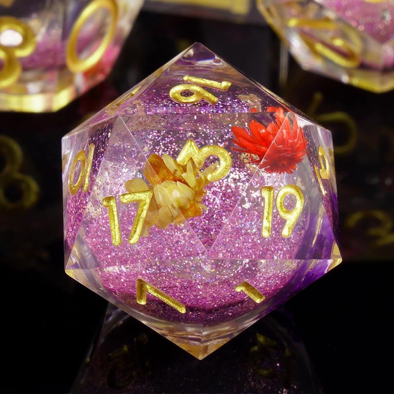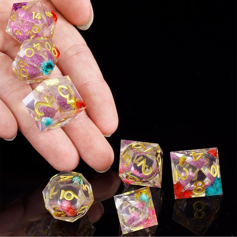 Sarini 7-teiliges Würfelset mit Flüssigkern und Kunstharz,scharfe Kanten,polyedrische DND-Würfel für Dungeons and Dragons,RPG,MTG-Tischspiele (lila Blume)